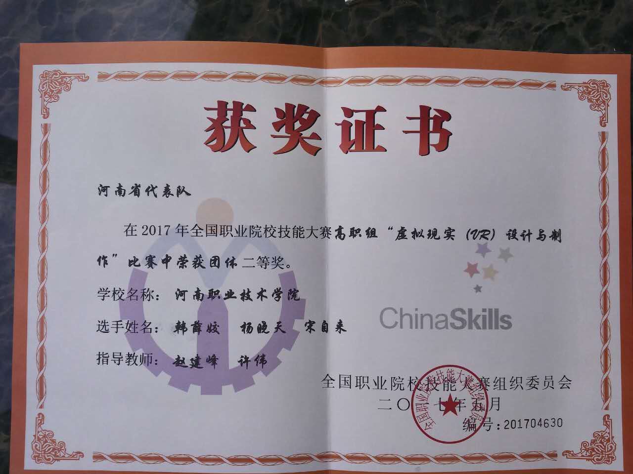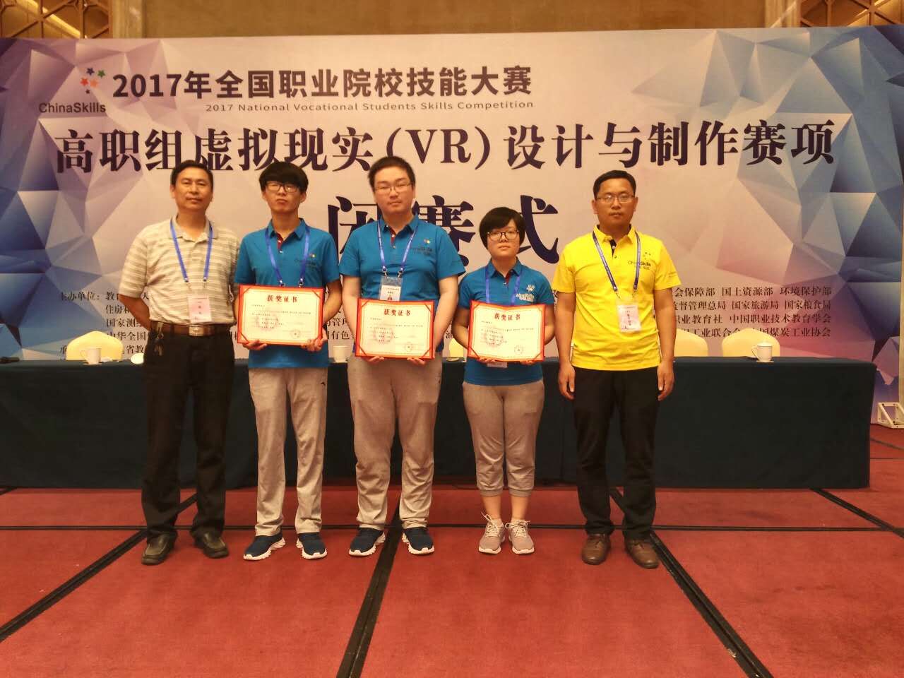 5月26日,2017年全国职业院校技能大赛高职组“虚拟现实(VR)设计与制作”赛项在福建船政交通职业技术学院举行,共有来自全国71个院校代表队的223名选手参赛。经过激烈角逐,我院信息工程系学生韩薛姣、杨晓天和宋自来三位同学在指导教师赵建峰和许伟的指导下,荣获团体二等奖的好成绩。