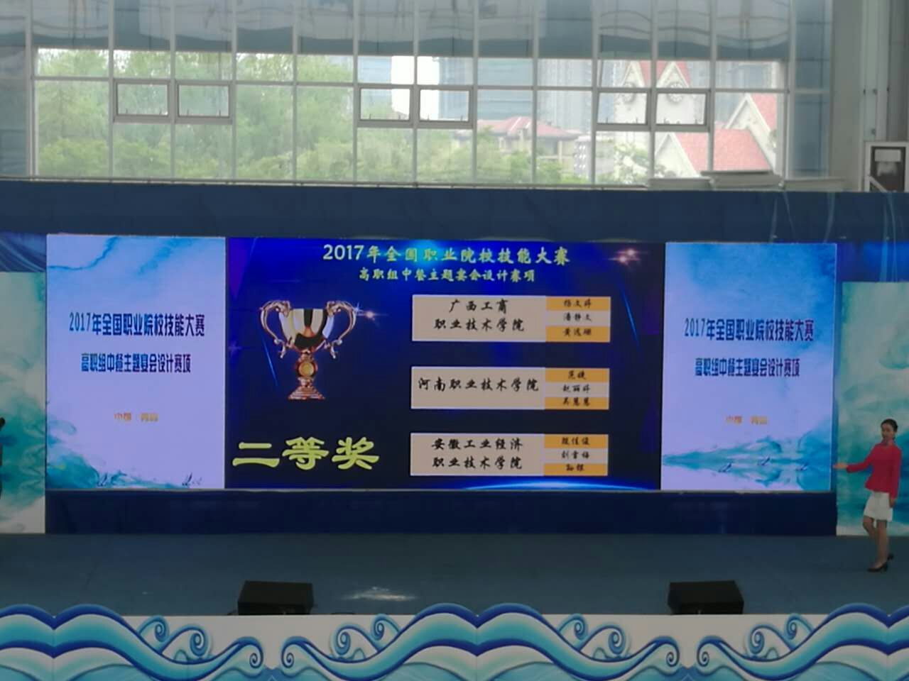 5月21日,“2017年全国职业院校技能大赛——中餐主题宴会设计项目”在青岛酒店管理职业技术学院落下帷幕。大赛共有来自全国各省市自治区的83所高职院校249名学生参赛。在为期三天的比赛中,我院旅游管理系的范婕、赵丽婷和吴慧慧等三位同学凭借扎实的专业基本功、新颖的台面设计和良好的心理素质脱颖而出,最终获得团体二等奖,这也是本次河南省参赛队在此赛项中的最好成绩。