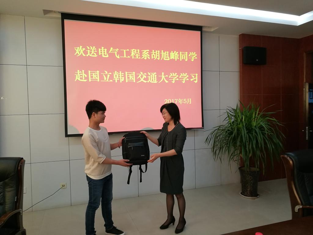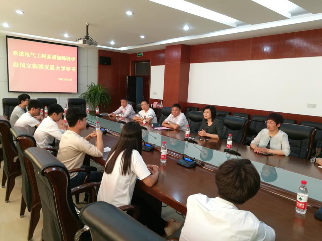 5月16日,电气工程系在行政楼A303会议室举行首批赴韩留学学生欢送会。该系电子153班学生胡旭峰将赴韩国国立交通大学学习。院长李桂贞出席并讲话。合作办学处和电气工程系相关负责人及部分学生代表共14人参加了欢送会。