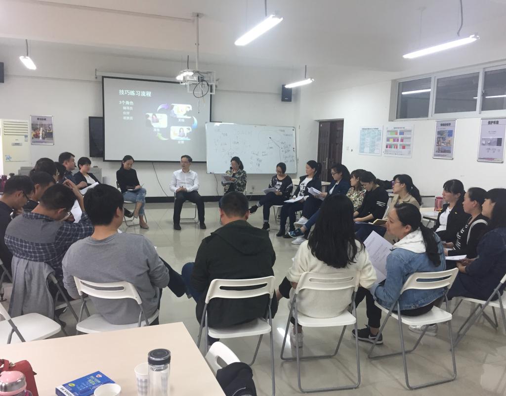 本次培训采用分组、互动体验式教学模式,主讲老师从“教练型辅导员”涵义入手,结合“思维”、“情绪”“意志”三个维度,就五大情商技巧(表达尊重、积极聆听、启发提问、分享内心、支持承担)和GROW(设定目标、澄清现状、方案选择、共识行动)模型的建立进行了详细讲解,通过团队建设、小组演练、情景活动、现场答疑等丰富多样的教学形式,采用讲授与讨论结合、动态操作与真实案例练习结合的教学方法,多角度、全方位的带领辅导员体验用聆听、提问的方式,挖掘学生潜力、引导学生思考、促使学生自己找到解决方式,并督促学生制定目标、计划,推动其行动,最终达成目标。