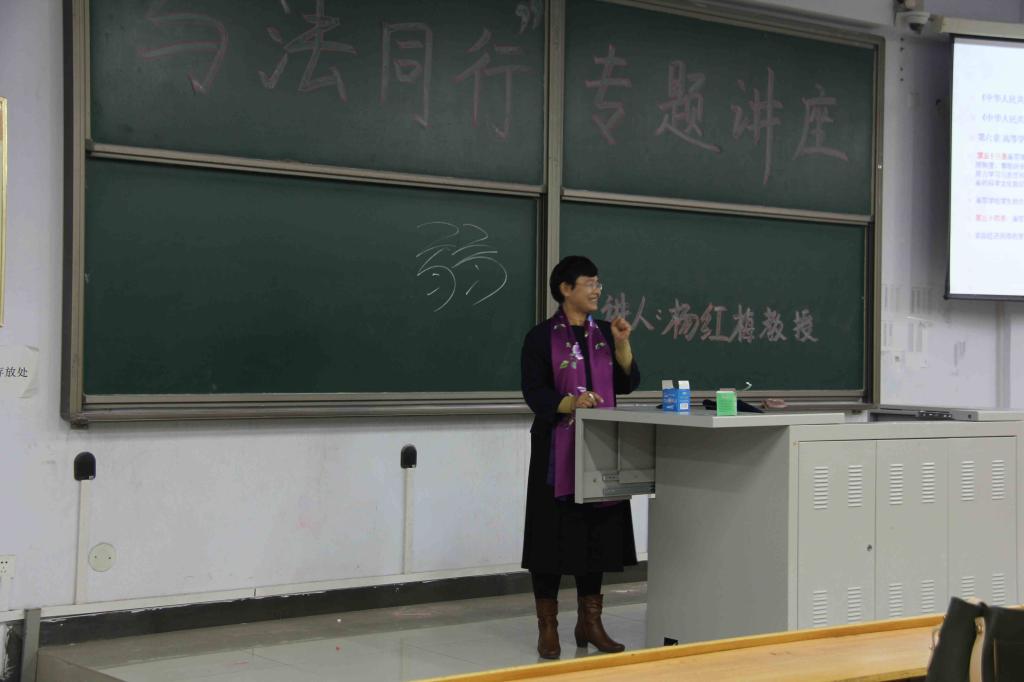 讲座上,杨红梅教授从什么是法、为什么要“与法同行”和怎样“与法同行”为切入点,详细讲解了高校学生有哪些基本权利和如何进行维权,并引用真实案例,向同学们传授了维权过程中的方法和技巧。她还着重讲解了“与法同行”的重要性。