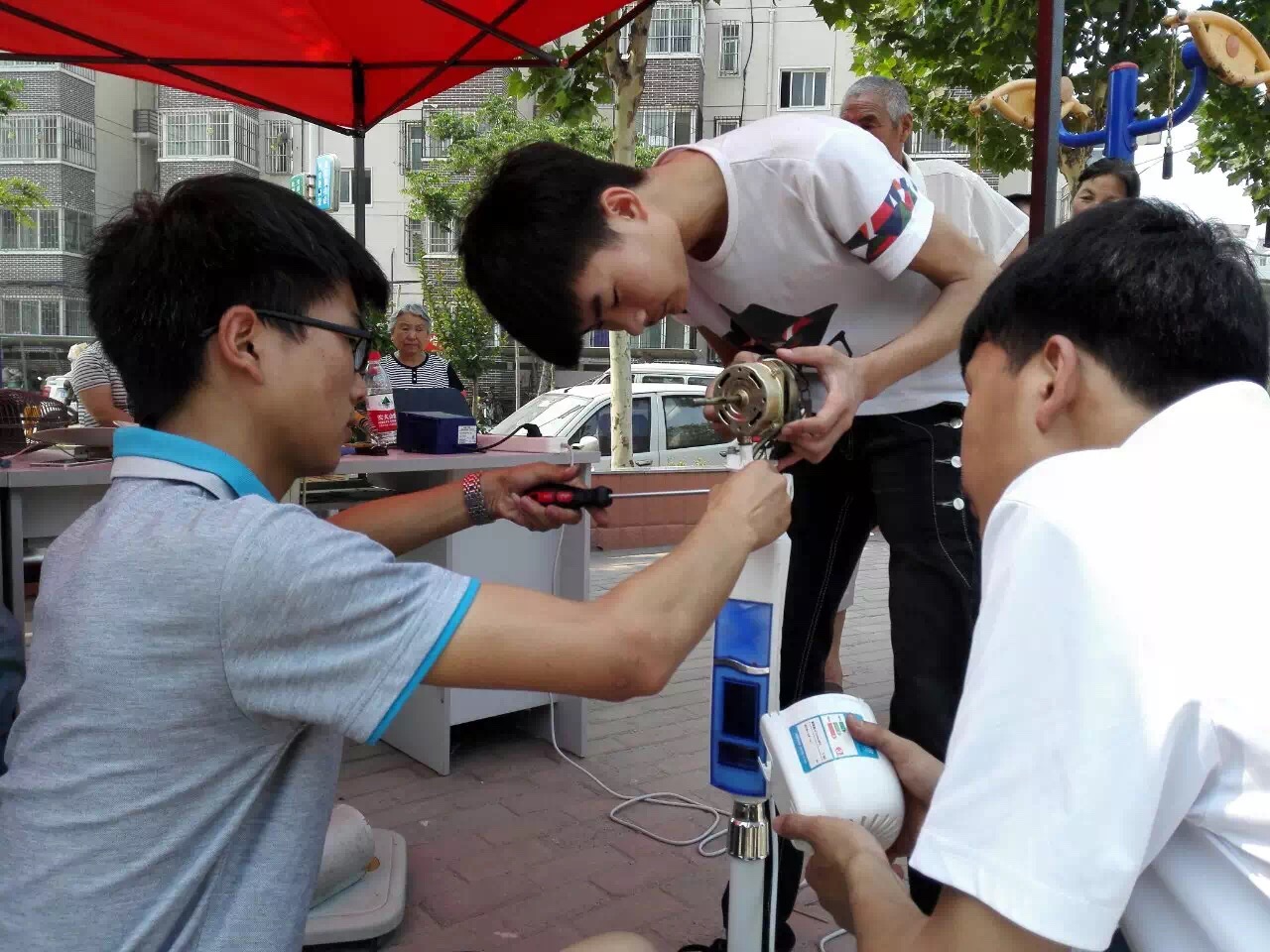 活动现场,前来维修家电的群众络绎不绝,我院师生志愿者不畏酷暑,热情接待前来维修家电的群众,并仔细询问和检查家电的损坏情况,认真作好维修登记工作,一丝不苟地维修每一件家电。活动当天共维修电风扇、电热杯和电饭锅等小家电二十余件。师生志愿者们丰富的理论知识、扎实的实践功底和精湛严谨的技术水平得到了社区群众的的一致好评。同时,也体现了我院师生志愿者的时代精神,在弘扬雷锋精神、传承中华民族优良传统美德的责任中,以及推进学院结对帮扶社区精神文明创建工作起到了重要的作用。(供稿:刘竹,审稿:霍本瑶、朱永宽)