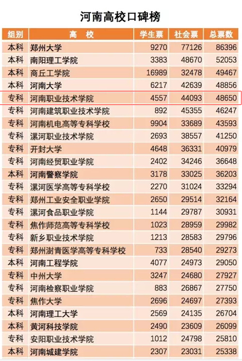 本次口碑榜调查活动是由《河南教育》(高教)杂志主办的2015年“河南129所高校口碑榜大调查活动”,活动通过河南高教微信公众号和大学之大微信公众平台于2016年1月25日至2月25日寒假期间进行投票活动。学院广大师生、学生家长、用人单位以及社会各界人士积极参与投票活动,最终,学院以学生票4557票、社会票44093票、总票数48650票的优势,领先同类学校2403票,位列专科组榜首。(供稿:吴猛,审稿:孙留欣)