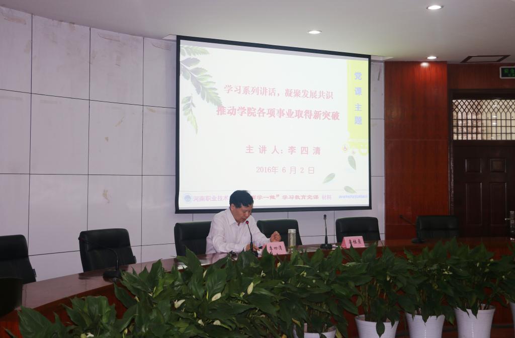 6月2日下午,党委书记李四清以“学习系列讲话,凝聚发展共识,推动学院各项事业取得新突破”为主题,为学院党委成员、副处级以上干部、正高级职称人员、享受国务院特殊津贴人员、党支部书记,师生党员代表和“两学一做”学习教育领导小组办公室全体成员共130余人讲专题党课。专题党课由院长李桂贞主持。