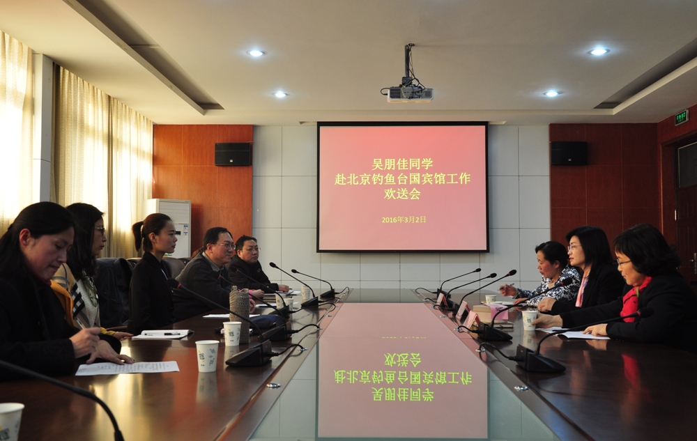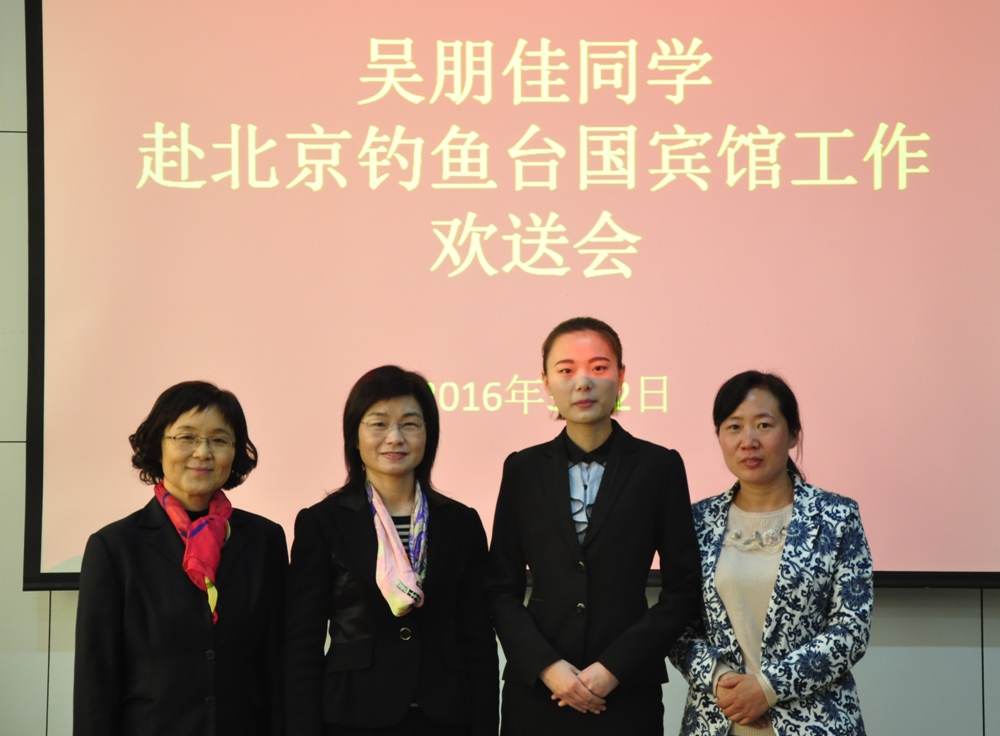 3月2日下午,学院为旅游管理系学生吴朋佳赴北京钓鱼台国宾馆工作举行欢送会。院长李桂贞、副院长肖珑和田华,以及该系领导和部分教师参加了欢送会。