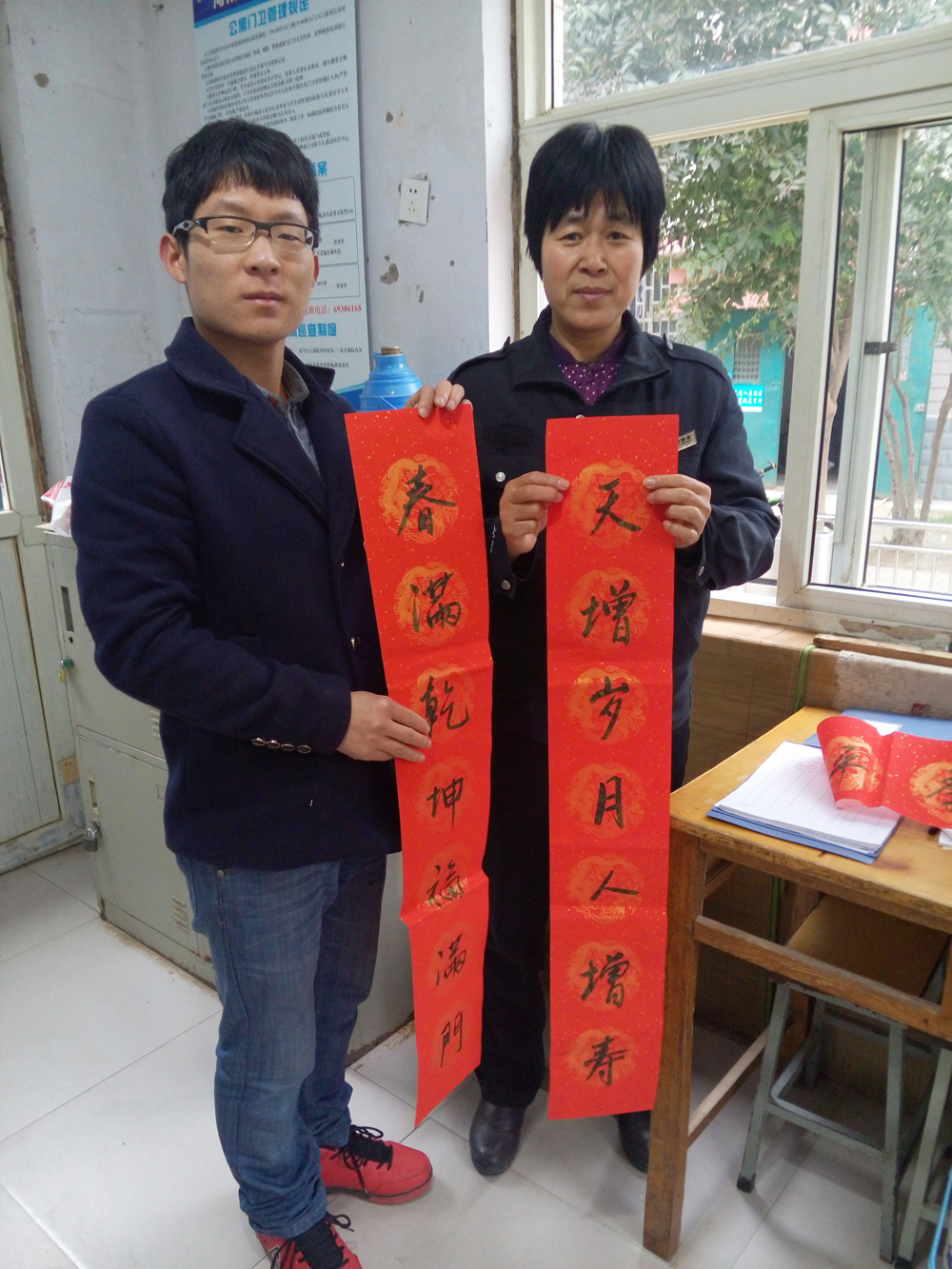 新年新气象,祝福送不停。1月4日和5日,书画社的同学们特地将“玉宇澄清浮正气 金猴奋起树新风”、“春归大地人间暖,福将神州喜临门”等一幅幅红彤彤的春联送到了保安、清洁工、宿舍管理员等广大工勤人员的手中,代表我院莘莘学子送上新春慰问和美好祝愿,感谢他们为保障校园秩序、环境清洁默默付出的辛勤劳动。