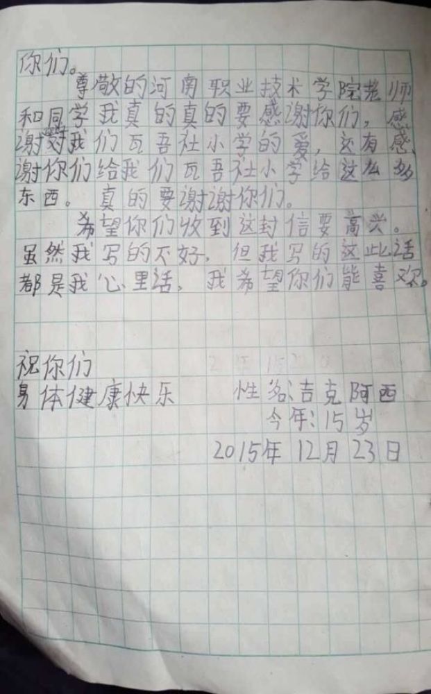 瓦吾社小学是该系2014届优秀毕业生张磊同学所支教的山村小学,同学们收到邮寄来的学习和体育用品后十分激动和开心。其中吉克阿西小朋还发自内心地给环艺系的叔叔阿姨、哥哥姐姐们写了一封题为“善良的河南老师和同学”的感谢信,她在信中这样写到“尊敬的河南职业技术学院老师和同学,我真的要感谢你们,感谢你们对我们瓦吾社小学的爱,还有感谢你们给我们瓦吾社小学这么多好东西,真的要谢谢你们。希望你们收到这封信要高兴,虽然我写的不好,但我写的这些话都是我心里话,我希望你们能喜欢…”。该系师生看到来信后都被孩子们的懂事和质朴而感动,更为孩子们生活的困苦、学习的匮乏和窘迫而忧心。该系师生纷纷表示将会继续关注这些大山里的孩子,发动身边的同事和同学们给予他们更多的关爱和支持,把我们河职爱心正能量永远传递下去,为社会做出更大的贡献。
