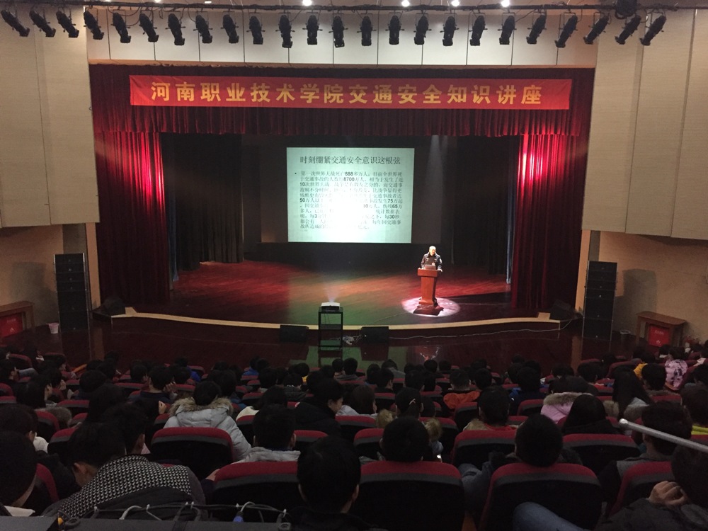 为了进一步增强全体学生的交通安全意识和交通法制意识,12月10日下午,由学生工作部联合保卫处共同举办的交通安全知识讲座在学院音乐厅举行。郑州市公安局交巡警支队第六大队办公室主任崔战立受邀主讲。我院600余名师生代表听取了讲座。