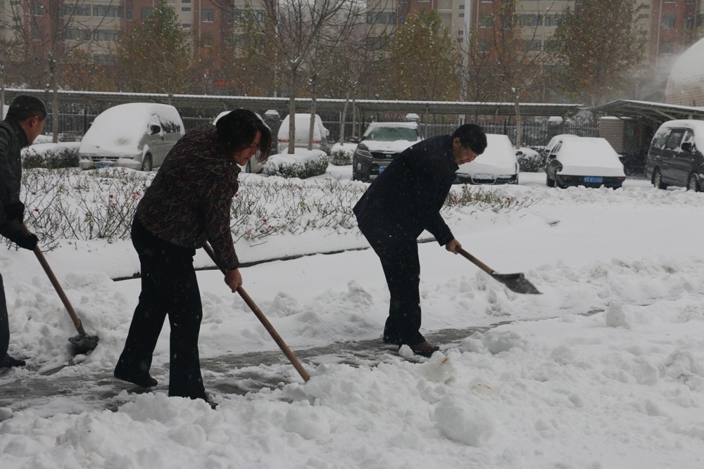 11月24日一上班,党政办和后勤管理处牵头,院属其他单位迅速组织广大教职工和学生志愿者义务清扫校园内主干道上的积雪。清扫积雪现场,学院领导、教职员工和学生志愿者一起,冒着纷飞的大雪和严寒,拿着铁锨、扫帚清扫道路积雪。经过三个多小时的紧张劳动,师生员工在校园内清理了一条通道,确保了师生通行安全,彰显了志愿服务精神。