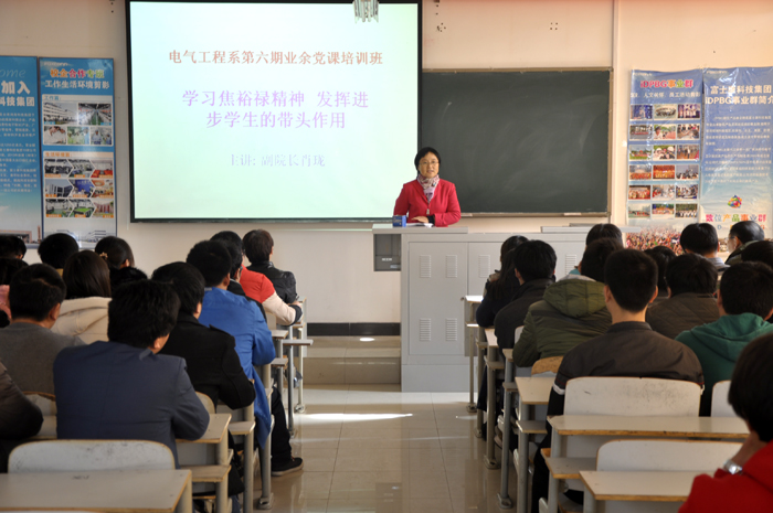 11月18日中午,肖珑副院长应邀为电气工程系第六期入党积极分子培训班做专题讲座。该系党总支部书记梁杰、副书记孙德胜及辅导员和本期学员共50余人参加。
