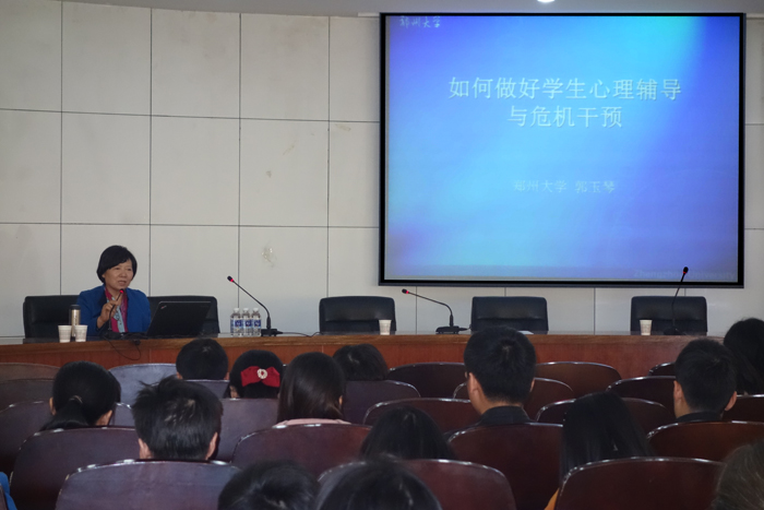 11月5日下午,作为我院第八届大学生心理健康教育宣传周活动之一的心理健康专家讲座顺利举办。郑州大学心理健康教育中心主任、教授郭玉琴应邀作“如何做好学生心理辅导与危机干预”专题讲座。各系(院)分管学生工作负责人、辅导员、学生干部及院团委、学生工作部、思想政治理论教学部等有关单位教职工共200余人参加。思政部主任王黎明主持。