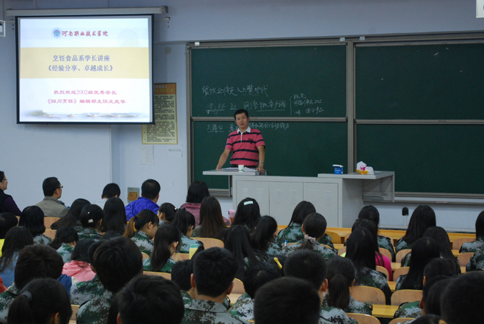 9月16日晚,烹饪食品系特邀优秀毕业生王兆华为该系2013级、2014级烹饪工艺与营养专业共270余名学生作了以“经验分享,卓越成长”为题的专业认知讲座。该系有关领导和教师参加。