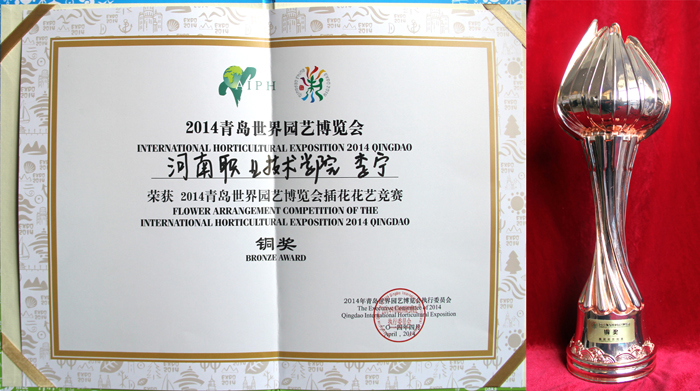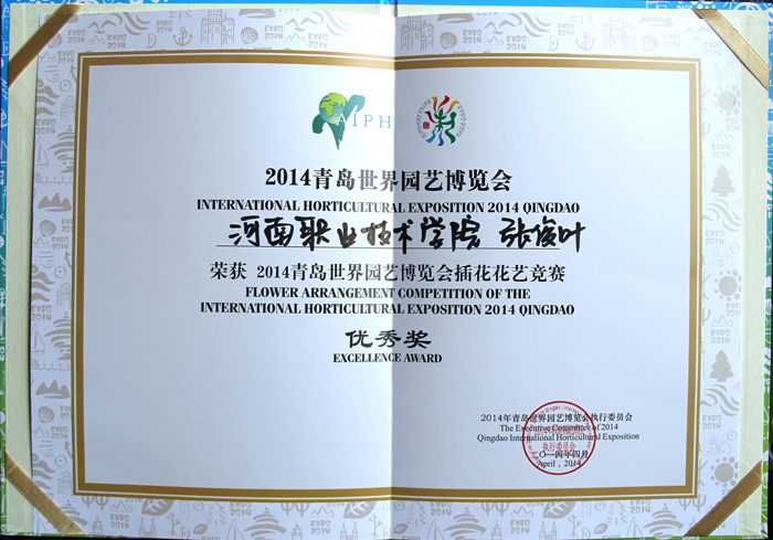 4月26日,2014年青岛世界园艺博览会插花花艺竞赛于在青岛市举行,共有来自国内外的46支代表队参加比赛。大赛共设金奖2名,银奖5名,铜奖11名,我院环境艺术工程系选派教师李宁和张俊叶组建两支代表队参赛。经过激烈角逐,李宁教师的作品《生如夏花》获得铜奖、张俊叶教师的作品《彩云追月》获得优秀奖。