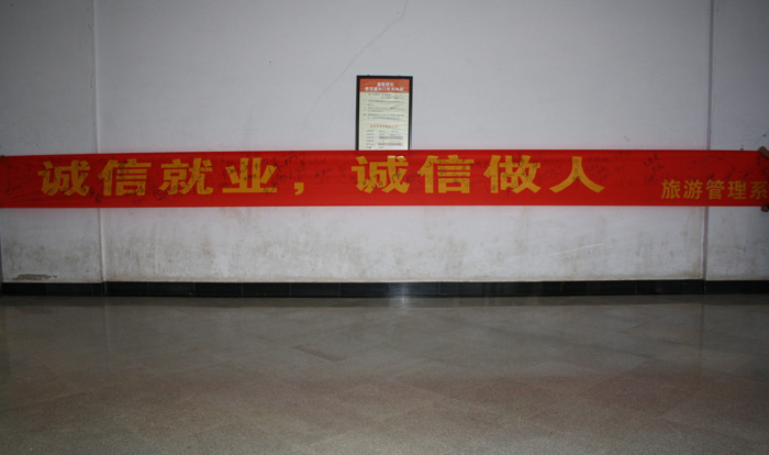 为引导毕业生树立正确的择业观,把诚信融入品德,贯穿择业的全过程,以诚信赢得用人单位的信任,增强当代大学生诚信的意识,11月12日下午,旅游管理系在一号教学楼组织举行了诚信就业签名活动。