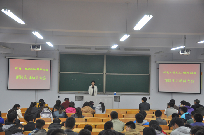 11月5日至6日晚,机电工程系两场顶岗实习动员大会在教学楼3110室举行。动员会明确了顶岗实习的意义、目标和任务等,强调了实习安全注意事项。系领导、教师和辅导员及2014届全体毕业生共600余人参加。