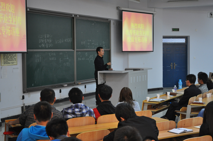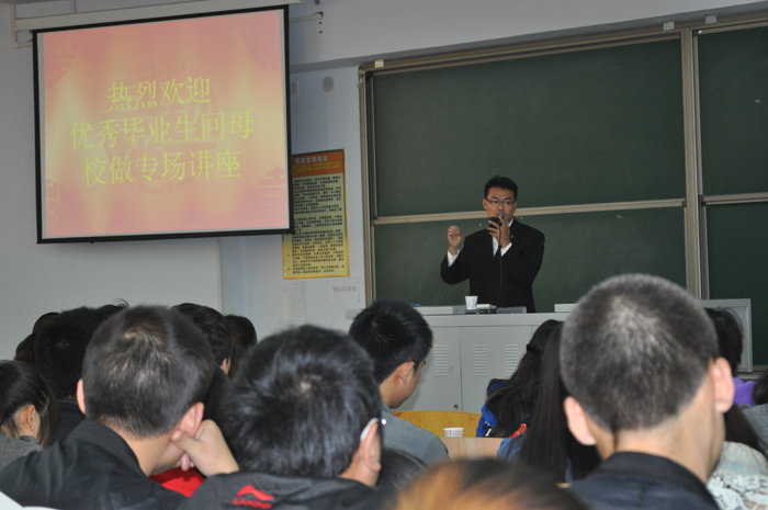 讲座中,优秀毕业生代表分别从实习、就业、创业不同的角度分享了他们的成长经历。现就职于阿利茄汁面餐饮有限公司担任营运督导的2005届烹饪专业毕业生李波,告诉同学们“信心和勤奋是实现职业理想的必要条件”,现就职于郑州龙德华餐饮管理有限公司担任常务副总经理的2006届烹饪专业毕业生刘晓坤,提醒同学们“明确的目标和准确的定位是走向成功的关键”,现就职于郑州金星啤酒厂担任业务员的2011届食品专业毕业生杨俊祥,告诫同学们“忍耐和坚持是痛苦的,但它却是让你崛起的有力武器”,三位毕业生代表带来的点睛之语和经验介绍让在场的同学受益匪浅。在现场提问环节,同学们踊跃提问,毕业生代表热情回答,现场气氛十分活跃。