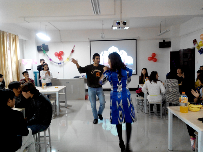 同汉族的端午、中秋一样,古尔邦节对于穆斯林民族而言,也是一个非常重要的节日。下午的小雨带来了秋日的凉意,但活动现场却暖意融融。同学们跳起民族舞蹈,唱起家乡歌曲,曼妙的舞姿和悠扬的歌声表达了他们对家乡的热爱和对亲人的思念。大家品尝着专程买来的新疆特色水果和点心,话民俗、叙情谊、谈感受、说理想,在欢快又充满民族特色的歌舞表演中共享大家庭的温暖,整个教室洋溢着节日的喜庆气氛。院团委书记杨华也代表全院师生向少数民族同学们表达了节日的问候和祝福,希望同学们能够增进感情,亲密和谐。活动丰富了少数民族同学的课余生活,增进了各民族同学之间情感交流和深厚友谊。