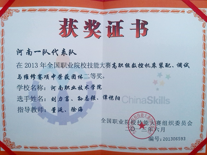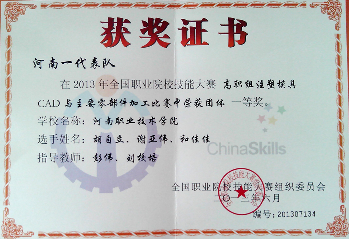 6月25日至26日,在天津举行的2013年全国职业院校技能大赛中,机电工程系学生代表队荣获高职组“注塑模具CAD与主要零件加工”赛项团体一等奖,“数控机床装配、调试与维修”团体二等奖。