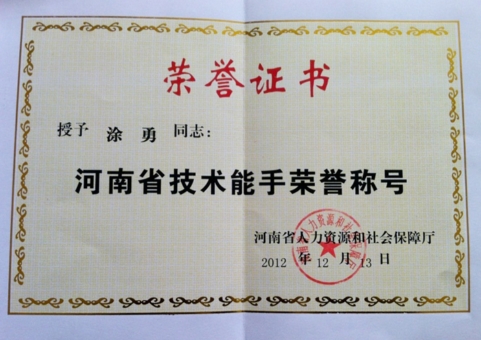 近日,根据河南省人力资源和社会保障厅有关技能人才评选表彰的决定,我院教师涂勇荣获第五届“河南省技术能手”荣誉称号。
