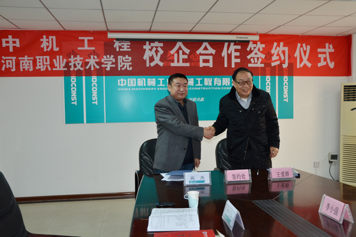 1月28日上午,院长王爱群、副院长肖珑带领合作办学处和机电工程系有关负责人一行五人,来到位于郑州市冉屯北路的中国机械工业机械工程有限公司,参加学院与该公司的校企合作签约仪式。该公司总经理高杰、党委书记刘毅、焊培中心主任楚锡荣、人力资源部经理张秀琴、技术质量部副经理杜世民参加签约仪式。