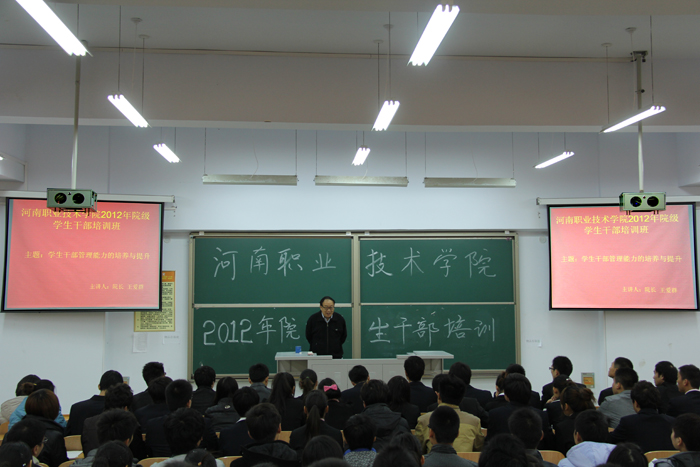 11月29日下午,我院2012—2013学年院级学生干部培训班开班仪式在3312教室举行。院长王爱群为300多名新聘任的院级学生干部作了《学生干部管理能力的培养与提升》的首场讲座。