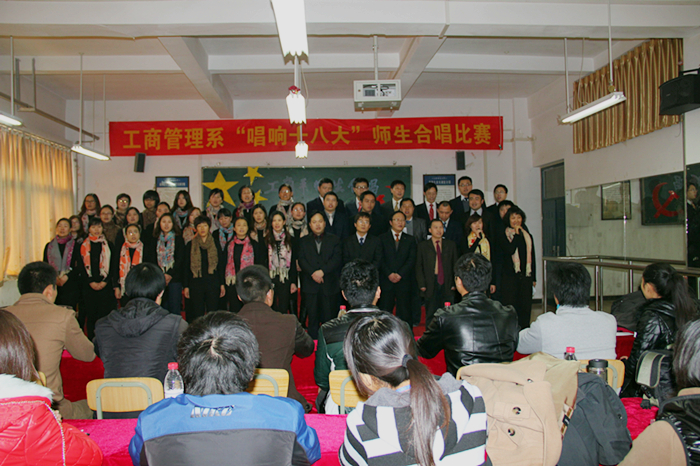 11月22日下午,由工商管理系党总支主办的“唱响十八大”师生红歌大合唱表演在商务礼仪实训室拉开帷幕。副院长占江亲临指导并参加了合唱表演。