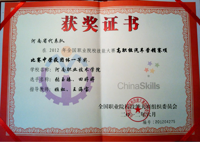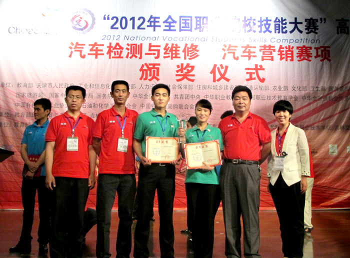 我院汽车工程系主任胡勇和实训中心副主任王文带领该系张玉臻、田婷婷2名学生组成的代表队参加了此次大赛。在姬虹和王海宝老师的精心指导下,经过周密细致的策划和部署,参赛选手冷静应战、沉着发挥,最终凭借扎实的基本功底、娴熟的职业技能、良好的心理素质和团结协作精神从61个参赛队中脱颖而出,荣获了本次大赛汽车营销赛项的团体一等奖,两位指导老师获得“优秀指导教师奖”。