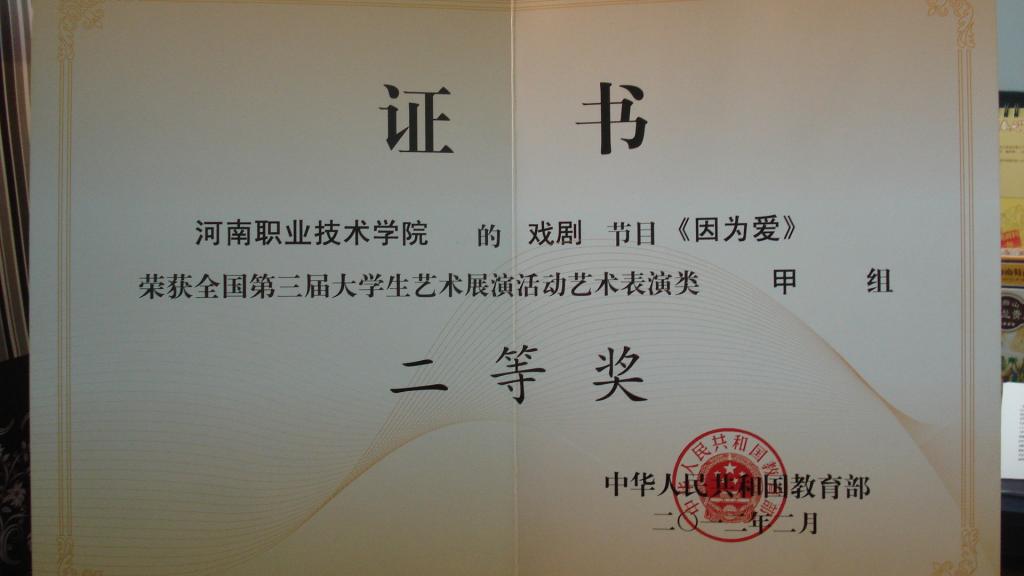 王爱群院长和肖珑副院长的书法作品荣获高校校长书画作品二等奖,肖珑副院长的摄影作品《翔》荣获高校校长摄影作品二等奖;由音乐学院创作的戏剧类节目《因为爱》荣获全国艺术表演类二等奖;音乐学院院长雷红薇、教师王达亮、武霄撰写的3篇论文均荣获艺术教育科研论文大赛一等奖。