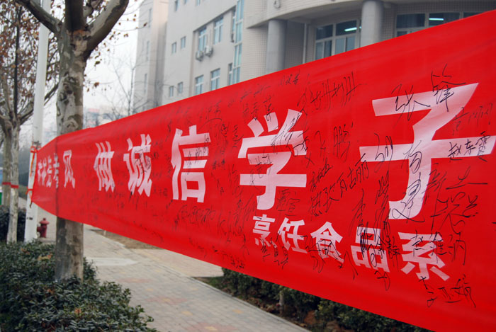 随后,在“树诚信考风,做诚信学子”主题签字仪式上,与会全体学生作为全系学生代表郑重在条幅上签下了自己的名字,承诺做诚信考试、拒绝作弊的模范,并要带动其他同学都加入到诚信考试行列中来。