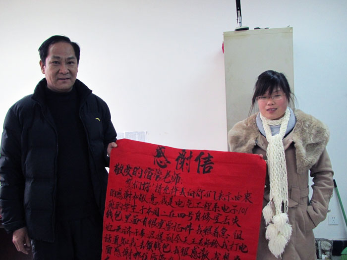 12月30日中午,徐艳艳同学向后勤处送来了感谢信,对后勤员工拾金不昧的行为表示感谢,并对我院后勤员工高尚的道德情操和精神风貌表示赞赏和肯定。