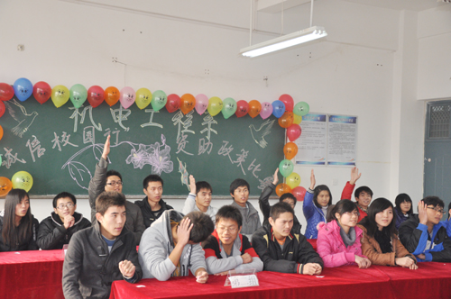 2011年12月2日下午,机电工程系“诚信校园行”学生资助政策及相关知识比赛在机电实训楼503教室隆重举行。院学生工作部部长兼学生处处长夏喜利、机电工程系党总支书记袁世先、机电工程系副书记朱永宽及相关辅导员来到比赛现场,来自机电工程系大一、大二学生的五个小组参加了比赛。夏处长在赛前发表讲话,介绍了本次活动的目的、内容、形式及意义,并预祝同学们比赛成功。本次比赛采用第一轮必答、第二轮抢答,经过激烈的角逐,评选出一等奖一名、二等奖两名、优秀奖两名。比赛结束后,袁书记做了总结发言,充分肯定了选手们的努力,号召大家将诚信发扬光大,带动身边的人加入诚信做人的行列。
