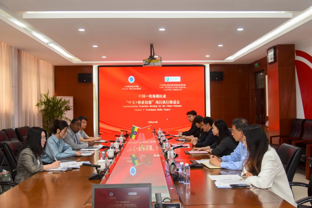 4月16日下午,河南职业技术学院召开中埃“中文+职业技能”项目推进会,埃塞俄比亚联邦技术职业培训学院国际关系与合作主管所罗门·梅孔嫩、河南联非商务信息咨询有限公司总经理马旭一行到访我校并参会。副校长任枫轩出席会议。国际合作交流处、智能制造学院、汽车与交通学院负责人及专业教师代表参会。