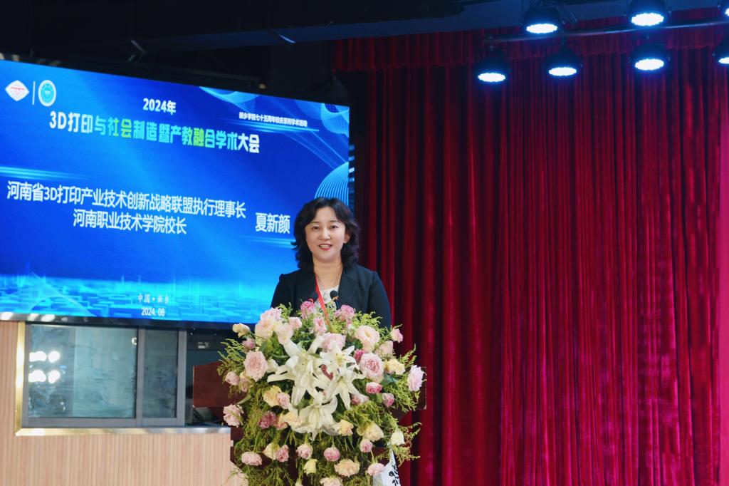 夏新颜作为河南省3D打印产业技术创新战略联盟执行理事长致辞,并主持了大会主旨报告。她介绍了河南省3D打印产业技术创新联盟在产学研用融合、科技开发创新、优势资源整合等方面取得的突出成效和改革实践。学校智能制造学院院长、二级教授王美姣作了题为《产教融合背景下3D打印技术应用与实践---以河南职业技术学院砂型3D打印研创中心为例》的大会报告,分享了3D打印技术在学校推进产教融合、科教融汇过程中的经验做法。