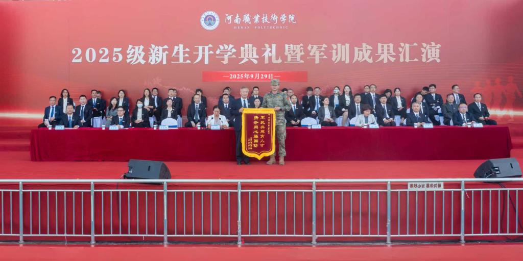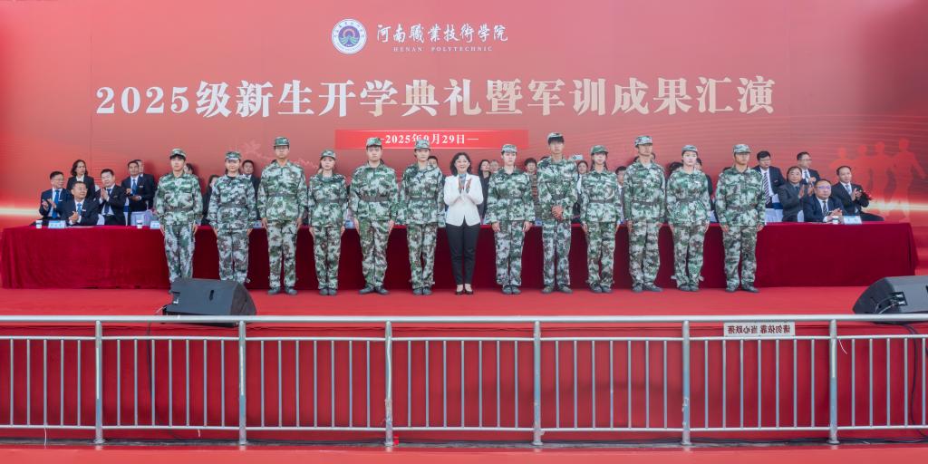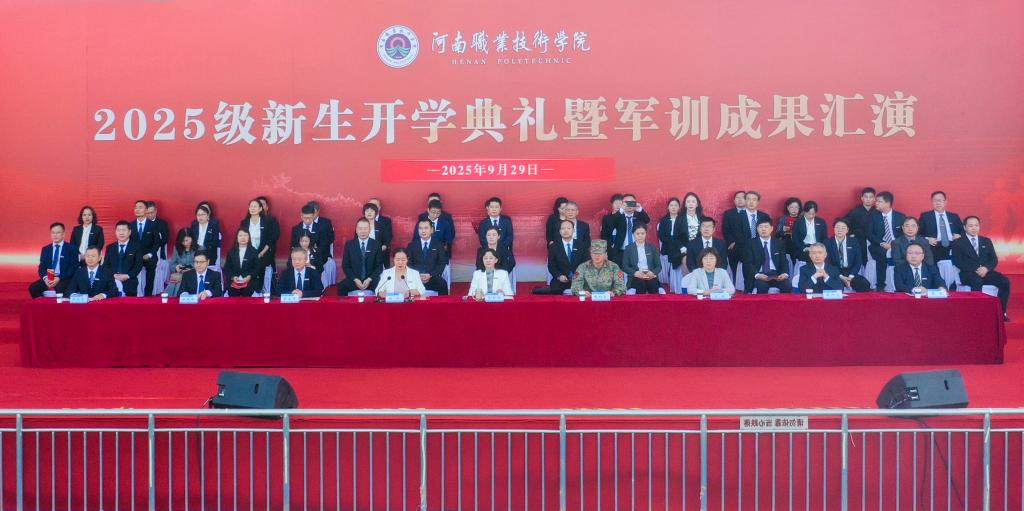 9月29日上午,河南职院举行2025级新生开学典礼暨军训成果汇演。夏新颜、田华、肖珑、李玉峰、盛兴文、任枫轩、鲁冬、朱永宽等在校校领导,金水区人民武装部选派总教官张利南出席典礼。校属各单位党政负责人,各二级学院党总支副书记、团总支(学工办)书记、新生辅导员及2025级全体新生参加典礼。校党委副书记、工会主席田华主持典礼。