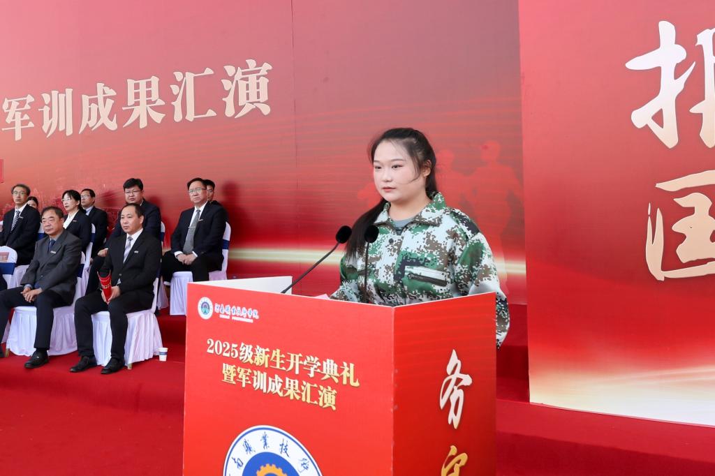 教师代表陈佳平结合自身40年从教经历激励同学们一要敢于“动手”,练就扎实本领;二要追求“卓越”,涵养工匠精神;三要注重“修身”,锤炼高尚品格。新生代表苏诗霞号召全体新生牢记“爱党、报国、拥军、荣校”的校园文化精神,全力以赴过好大学生活。校友代表夏中兵回望从河职入学到如今的成长之路,感谢母校给予的成长平台并希望2025级新同学守住初心、踏实前行,活成自己期待的模样。