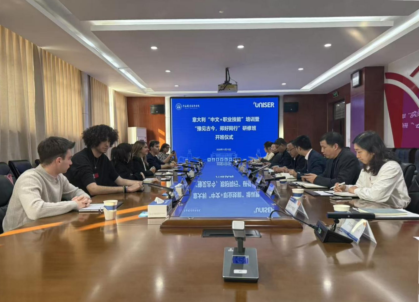 11月13日上午,河南职院首批欧洲青年学生“中文+职业技能”培训暨“豫见古今 郑好同行”研修项目开班仪式在勤业楼332会议室举行。校党委委员、副校长鲁冬出席并致辞。欧洲人才国际交流中心(UNISER)带队老师Vittoria Morosi和意大利弗洛朗蒂职业教育学院、伦巴第机电一体化产业技术学院等欧洲院校7名青年学生,以及国际合作交流处、国际教育学院相关负责同志参加开班仪式。