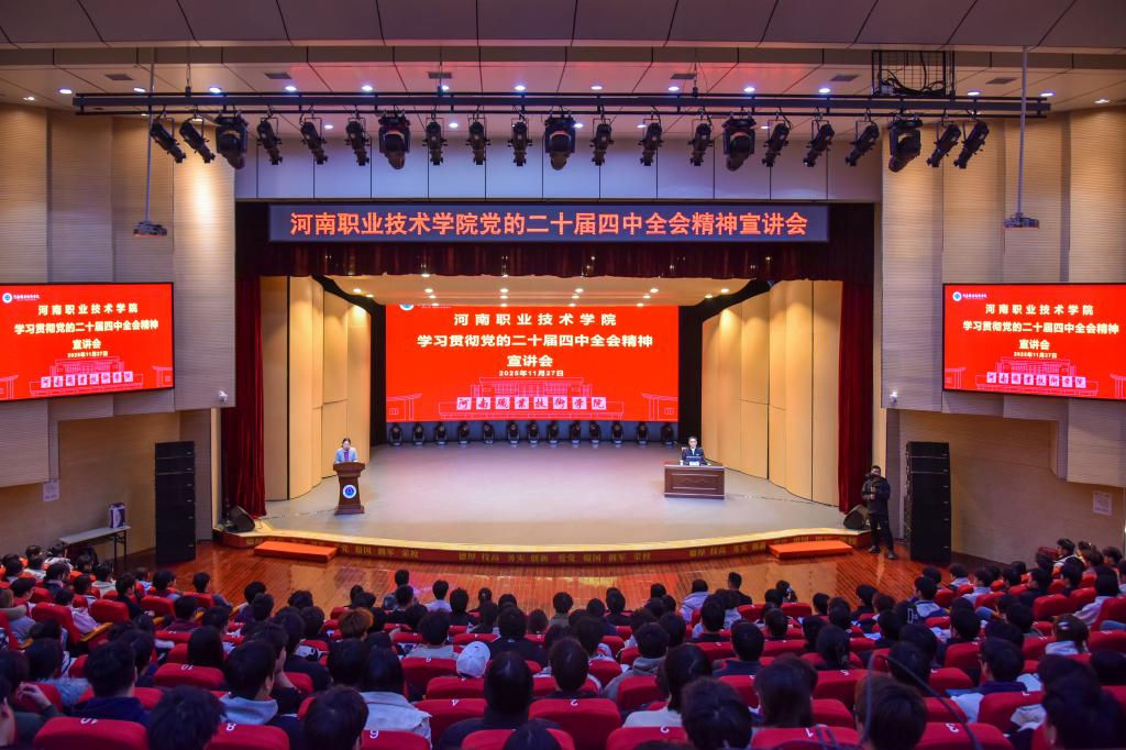 11月27日,河南职业技术学院党委书记厉励以《深学全会精神、勇担时代使命——在“十五五”新征程中书写精彩青春答卷》为题,为学校青年学生宣讲党的二十届四中全会精神。第七期校青马班学员、第一期团校学员、校院两级学生会主要学生干部代表、国旗护卫队全体成员、电子与物联网学院电子信息工程技术253班全体同学,以及党委宣传部、校团委等部门负责同志共500余人现场聆听。校党委副书记、工会主席田华主持宣讲会。