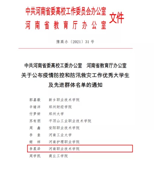 近日,河南省委高校工委办公室下发《关于公布疫情防控和防汛救灾工作优秀大学生及先进群体名单的通知》,全省仅有25名大学生被授予“疫情防控和防汛救灾工作优秀大学生”荣誉称号,河南职业技术学院环艺工程学院数媒201班学生李晨泽赫然在列。