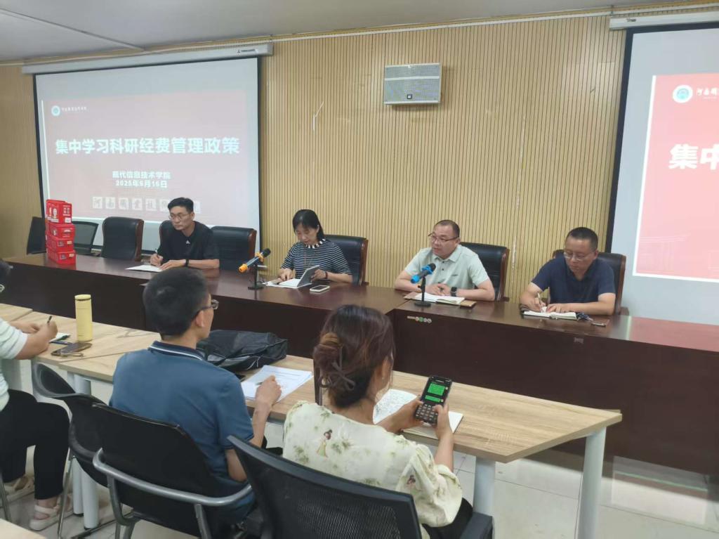 6月17日下午,学校现代信息技术学院在笃行楼525室召开全体教职工大会,集中学习科研经费管理政策。会议由学院院长李纪云主持。