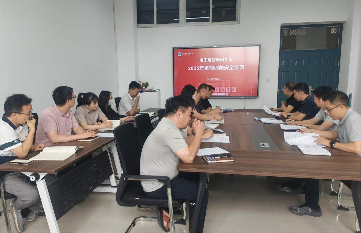 6月26日下午,学校电子与物联网学院召开了2025年暑期消防安全学习会。学院党总支书记谭营军主持会议,学院负责人娄松涛、副书记孙德胜、副院长孙雷明以及全体教职工参加会议。