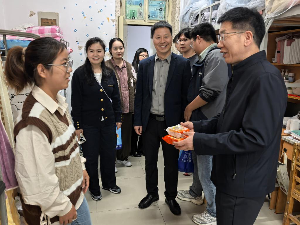 在学生宿舍,谭营军一行带着精心挑选的中秋月饼,热情地为学生送上节日的祝福,并与他们亲切交流。老师们详细询问了同学们的假期安排以及生活方面的需求,同时反复叮嘱大家要合理规划时间,注意用电安全和人身财产安全,遇到困难要及时向学院和老师反馈。老师们的关怀,体现在每一个细微之处。