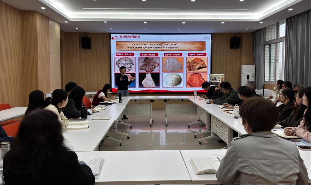 刘丽丽以《天下秩序与华夏共同体演进》为主题,从文字这一中华文明重要载体作为切口,揭示华夏共同体的孕育。课堂教学通过精妙的设计和构思把教材体系向教学体系转化,通过3D文物复原视频、甲骨文破译互动等数字化教学手段,使抽象理论具象化,教学内容鲜活化。在课后经验分享环节,刘丽丽结合全国第二届《中华民族共同体概论》课程教学展示活动参赛经历,提出“三维驱动”教学提升法:在内容建设方面,强调以“精准选题+鲜活表达”筑牢课程根基,通过“小切口”透视“大主题”,用“逻辑链”串联“知识点”,让“理论”穿上“故事外衣”;心态管理方面,倡导将“追名次”的焦虑转化为“磨课程”的专注,以“板凳要坐十年冷”的定力深耕教学;身心健康方面,分享了通过规律运动、科学膳食等方式保持高强度备赛状态的实践经验。