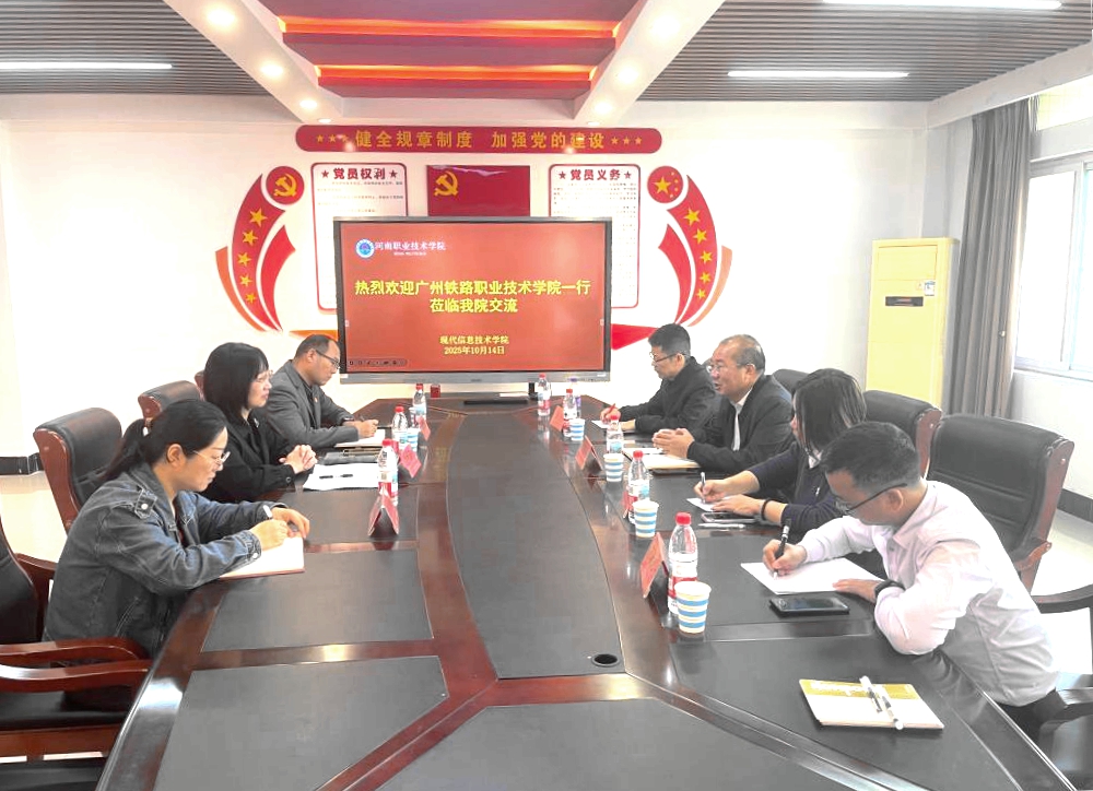 10月14日上午,广州铁路职业技术学院人工智能学院党总支副书记(主持工作)刘雨涛一行来学校现代信息技术学院考察交流。现代信息技术学院党总支书记、院长李纪云,副院长董俊磊等全程陪同考察。