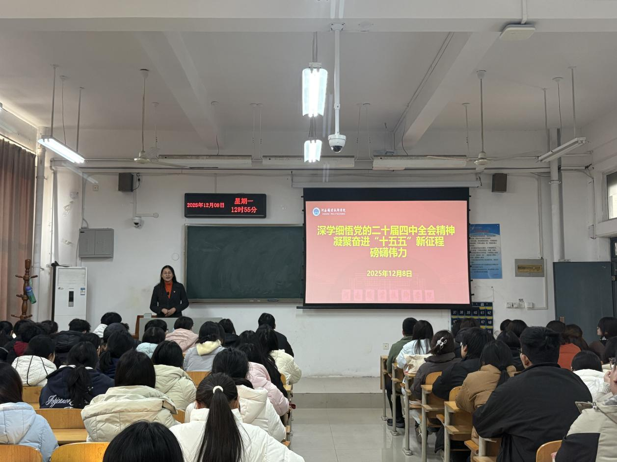 王延东在宣讲中,立足“十四五”收官与“十五五”谋篇布局的关键节点,系统阐释了党的二十届四中全会的重大历史意义和实践要求。她指出,全会审议通过的“十五五”规划建议,明确了基本实现社会主义现代化的阶段性目标,其中中国式现代化、共同富裕、高质量发展等核心部署,与青年学生的成长成才紧密相关。针对学生群体特点,她重点解读了“坚持以经济建设为中心”“强化科技创新”等战略任务的内涵,强调青年要主动聚焦国家战略需求,立足项目实践、志愿服务等实践活动中找准坐标,让专业所长成为服务国家发展的坚实支撑,以青春身影践行社会责任。同时,也要把个人职业规划与“十五五”规划部署同频共振,让理想信念在实干中落地生根,将个人成长的“小目标”融入民族复兴的“大蓝图”,用实际行动书写新时代青年的责任答卷。