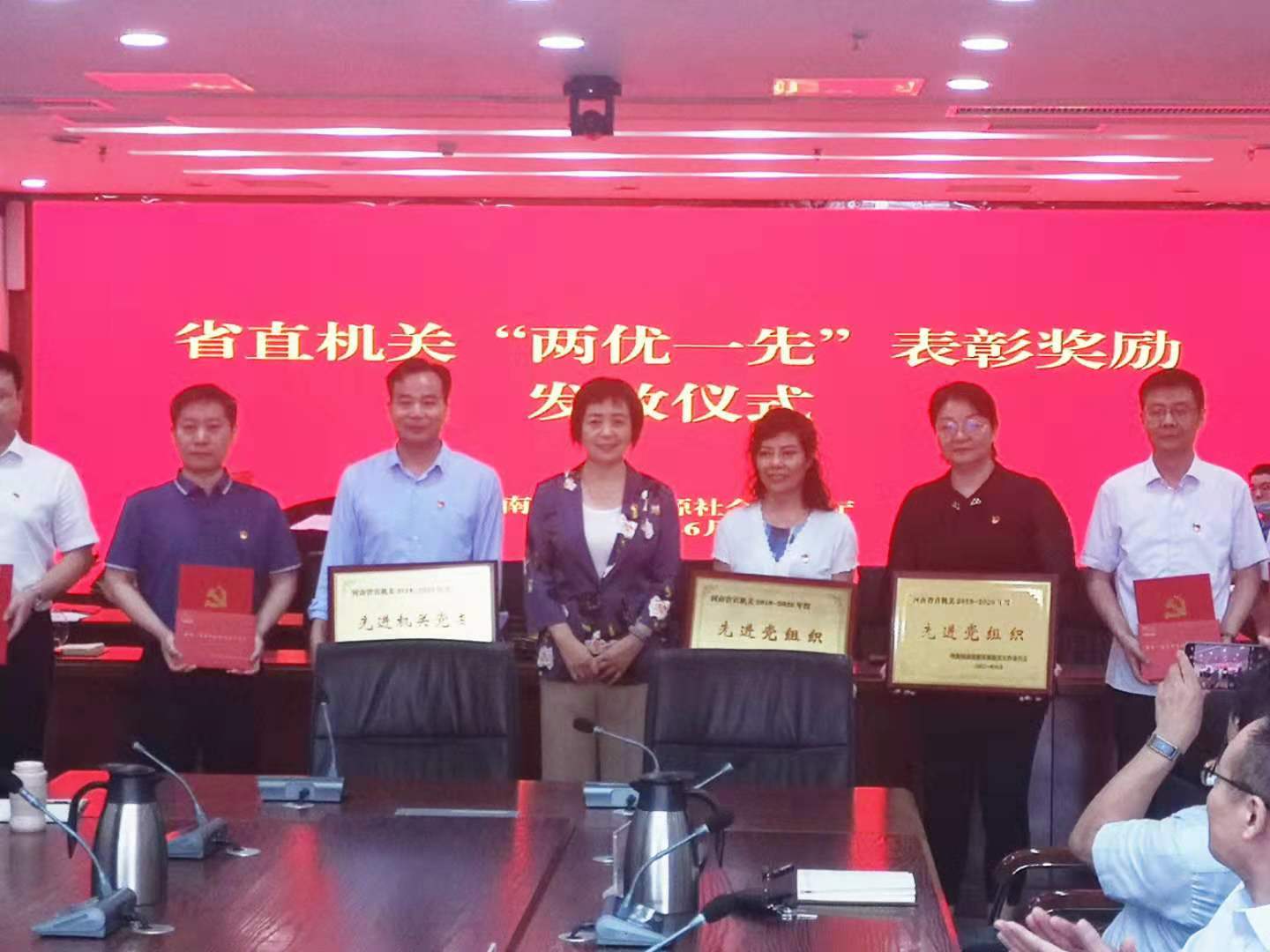 奋斗百年路,启航新征程。为激励先进、树好标杆,在中国共产党成立100 周年之际,河南省委直属机关工委表彰了179名优秀共产党员、130名优秀党务工作者和190个先进党组织。我校烹饪食品与健康学院党总支荣获“河南省直机关2019-2020年度先进党组织”称号。6月29日下午,在省政府机关办公大楼,省人力资源社会保障厅举行了省直机关“两优一先”表彰奖励发放仪式,我校烹饪食品与健康学院党总支书记张首玉作为代表接受了荣誉牌匾和纪念徽章。