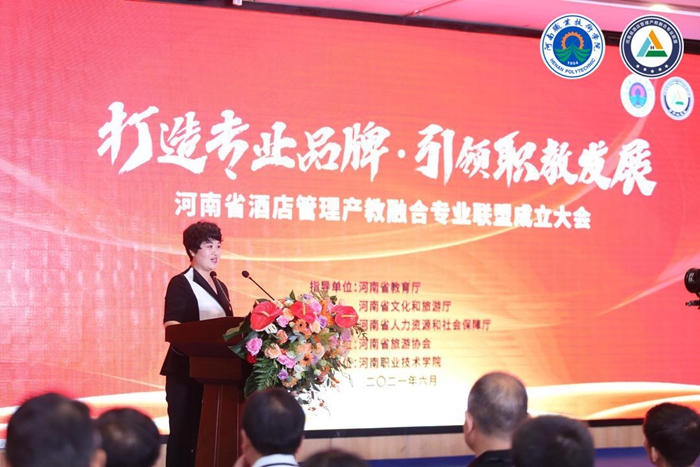 喜迎建党百年华诞,共商产教融合发展大计,6月26日上午,由河南省教育厅、河南省文化和旅游厅、河南省人力资源和社会保障厅指导,河南省旅游协会支持,我校牵头主办的河南省酒店管理产教融合专业联盟成立大会成功举办。河南省人力资源和社会保障厅党组成员、副厅长李海龙,河南省教育厅二级巡视员董玉民出席大会并致辞。省教育厅职成教处副处长张家成,世界旅游联盟副秘书长、浙江旅游职业学院王昆欣教授,省餐饮与住宿行业协会常务副会长张毅兵,省旅游协会秘书长滑蕾,以及省内51所院校和国内27家企业代表近200人参加大会。学校党委书记李桂贞致辞。学校院长梅乐堂主持了联盟成立和主题分享两个阶段的活动。