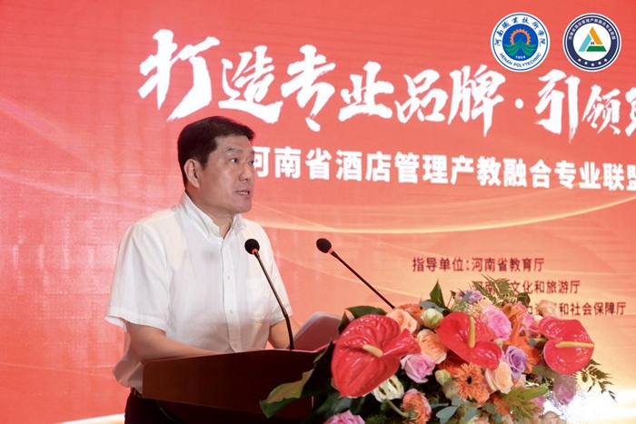 董玉民在致辞中对联盟的成立给予了高度评价,对学校一直以来积极推进产教融合、注重产教协同,强调文化创新,以及在实践中探索出的共建、共享、共赢的校企合作模式给予高度认可。他希望,联盟要发挥好“三个作用”:一是要发挥好联盟的平台作用,利用平台优势提升河南省各高校酒店管理类专业的办学水平和服务经济社会发展的能力;二是要发挥好学校的主导作用,开创资源共享、过程共管、人才共育、责任共担的产教融合、校企合作新局面;三是发挥好企业的主体作用,承担一定的人才培养责任,深度与联盟院校合作,通过产教融合,锻铸企业核心竞争力和品牌影响力。他指出,省教育厅将一如既往地支持高校与行业企业之间的产教融合工作,为打造河南省酒店管理专业教育的新高地做出更大贡献。