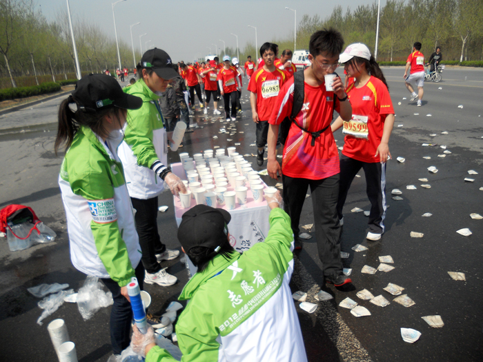 为做好本次大赛的服务工作,志愿者师生凌晨4点奔赴大赛物资中心,领取物料送至指定地点,并将由我院负责的指定线路地段的供水站、服务站建立起来。比赛开始后,大家更是一丝不苟地为选手们服务,递水、送海绵、指引路线,尽职尽责地圆满完成工作任务。
