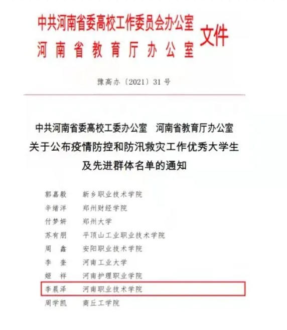 近日,河南省委高校工委办公室下发《关于公布疫情防控和防汛救灾工作优秀大学生及先进群体名单的通知》,全省仅有25名大学生被授予“疫情防控和防汛救灾工作优秀大学生”荣誉称号,河南职业技术学院数创学院数媒201班学生李晨泽赫然在列。