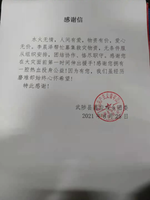 送完第一个捐赠点来不及休整,李晨泽和司机又往其他乡镇赶去,待圪垱店镇、谢旗营镇、乔庙镇等捐赠点送完,天边已经泛白。李晨泽说,这次线下送物资行动对他触动很大,一路上,他看到被水浸泡倒塌的房屋、被水淹没的农田、被水冲毁的道路、还有穿着各色制服的救援团队,心酸又感动。“真实感受到,大灾面前有大爱,不是一句空话,是实实在在的行动。”